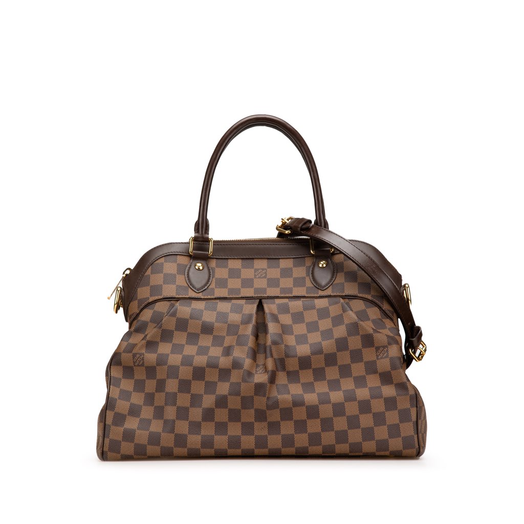 The Trevi GM features a damier ebene canvas body with leather trim, rolled leather handles, a detachable flat leather strap, a top zip closure and interior slip pockets.