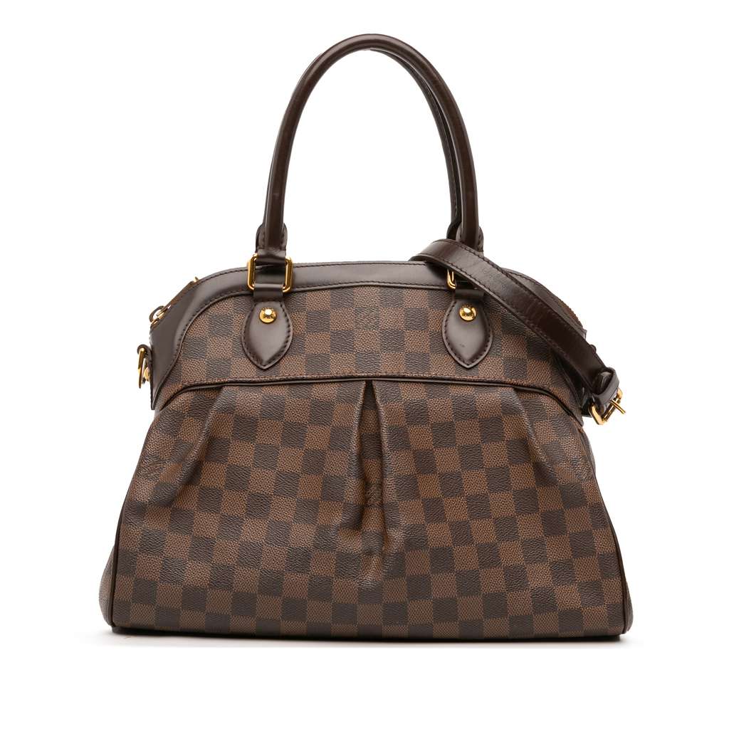 The Trevi features a damier ebene canvas body with leather trim, rolled handles, a detachable flat leather strap, a top zip closure, and interior slip pockets.