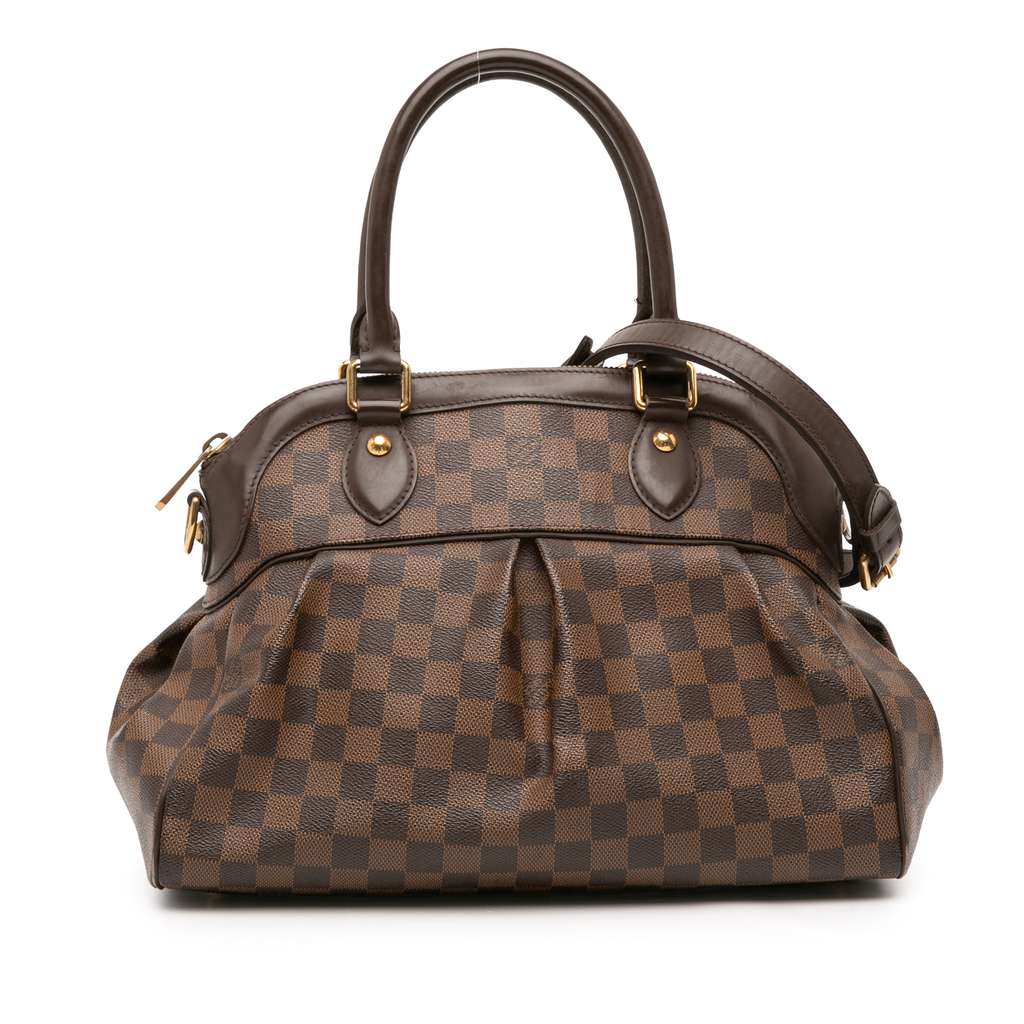The Trevi features a damier ebene canvas body with leather trim, rolled leather handles, an adjustable and detachable flat leather strap, a top zip closure, and interior slip pockets.