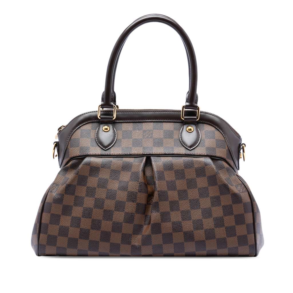 The Trevi features a damier ebene canvas body with leather trim, rolled leather handles, a top zip closure, and interior slip pockets.