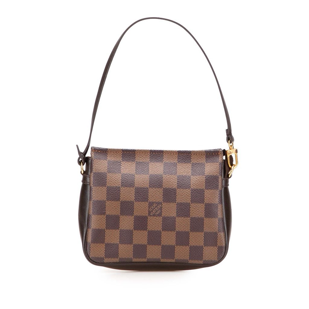 The Trousse Pochette features a damier ebene canvas body with leather trim, a flat leather strap, and a top zip closure.