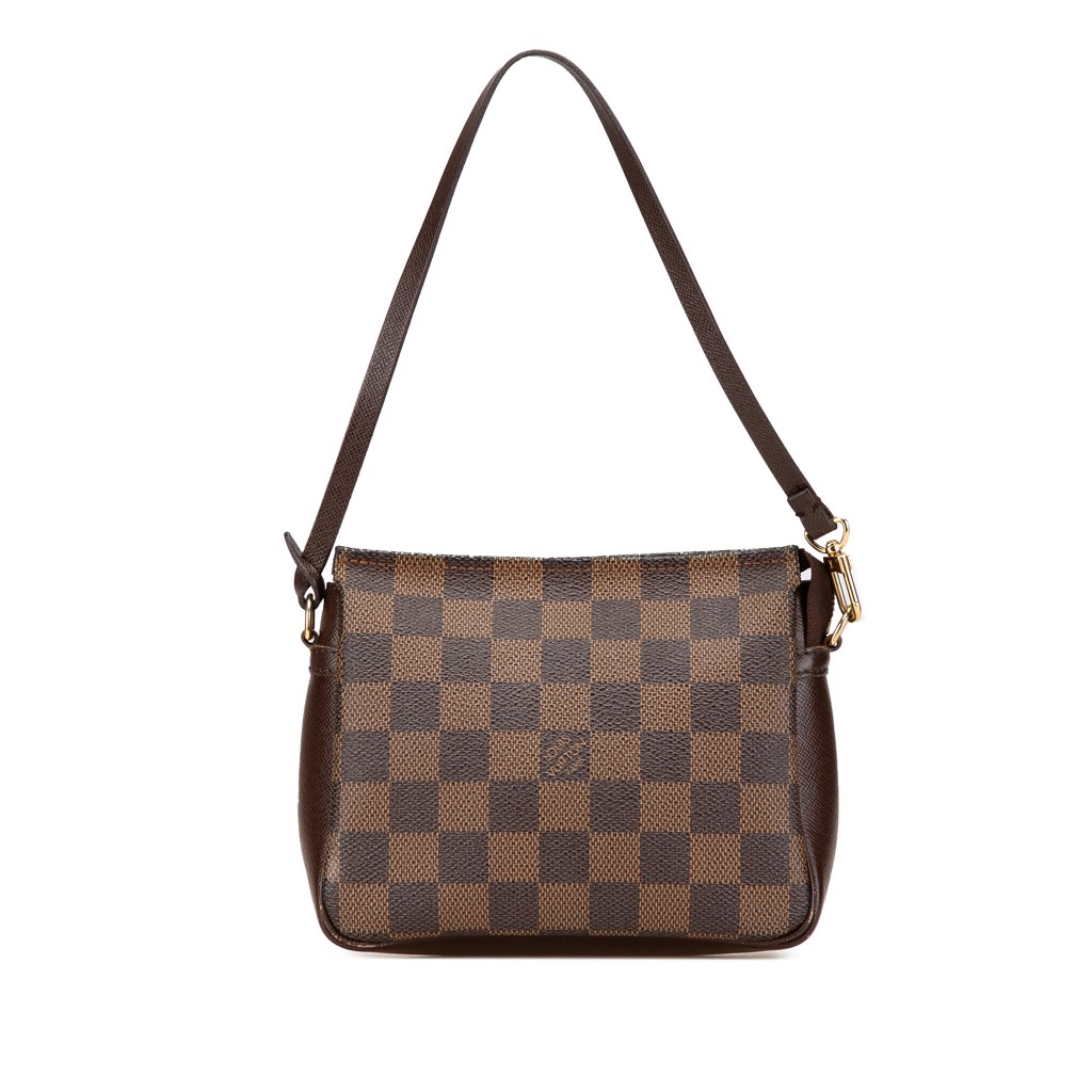 The Trousse Pochette features a damier ebene canvas body, a flat leather strap, and a top zip closure.
