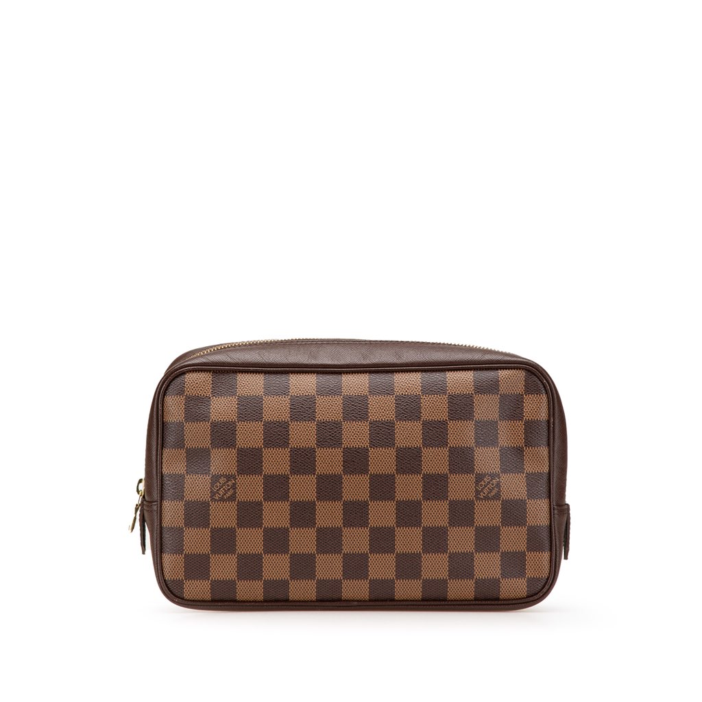 The Trousse Toilette features a damier ebene canvas body with leather trim, top zip closure, and interior slip pockets.
