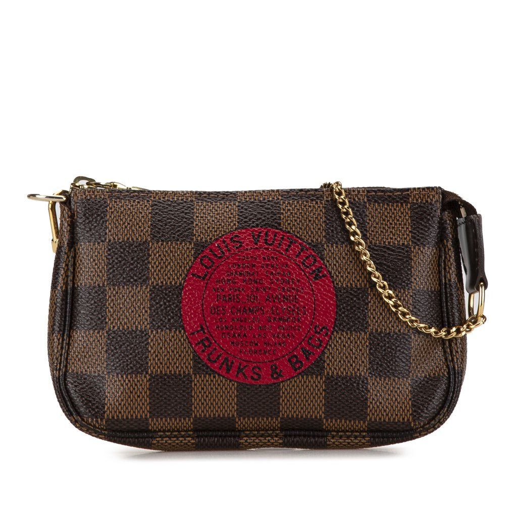 The Mini Pochette Accessoires features a damier ebene canvas body, a gold-tone chain strap, and top zip closure.