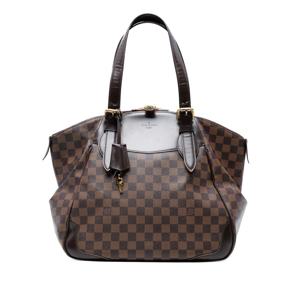 The Verona GM features a damier ebene canvas body with leather trim, flat leather straps, a two-way top zip closure, and interior slip pockets.