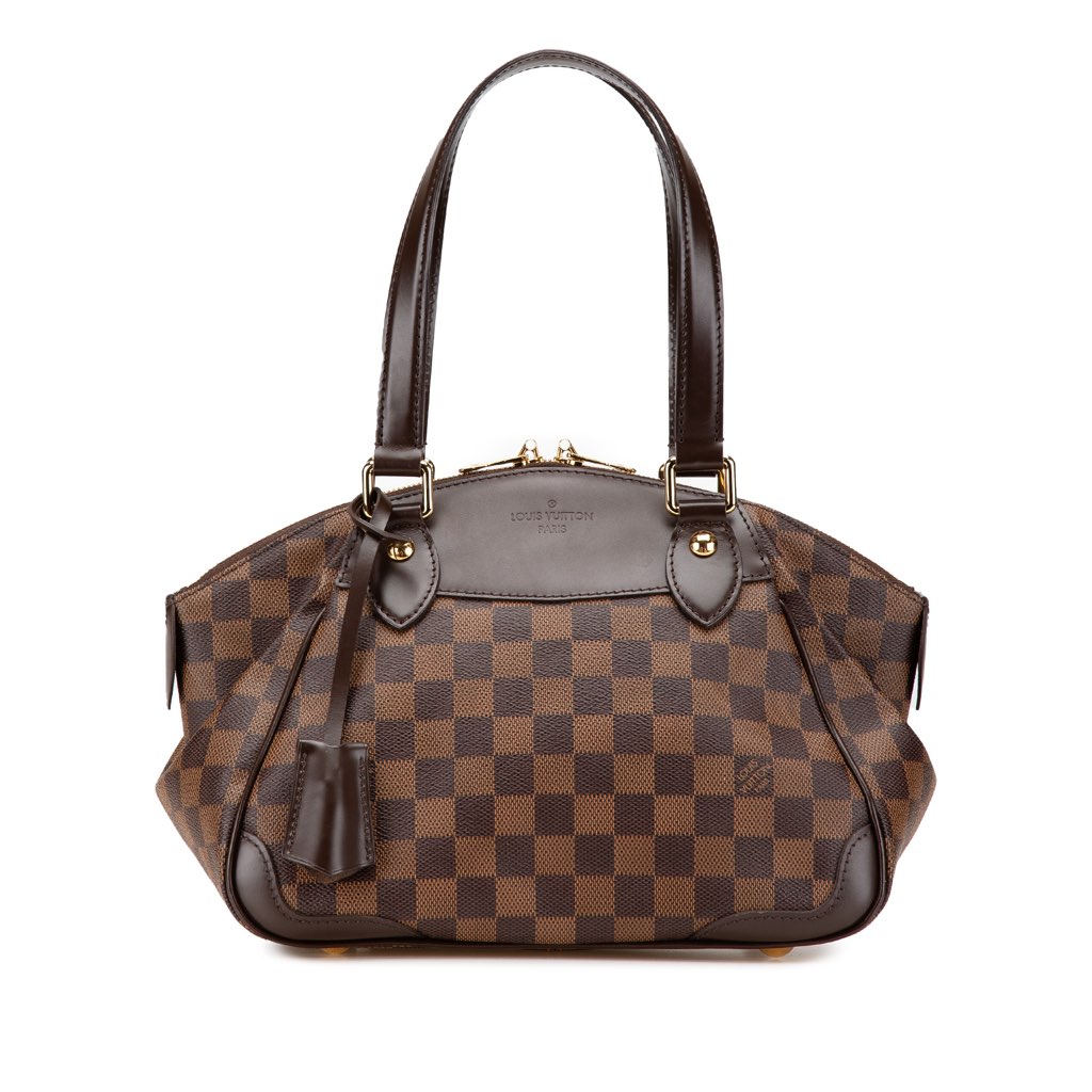 The Verona PM features a damier ebene canvas body with leather trim, flat leather handles, a top zip closure, and an interior slip pocket.
