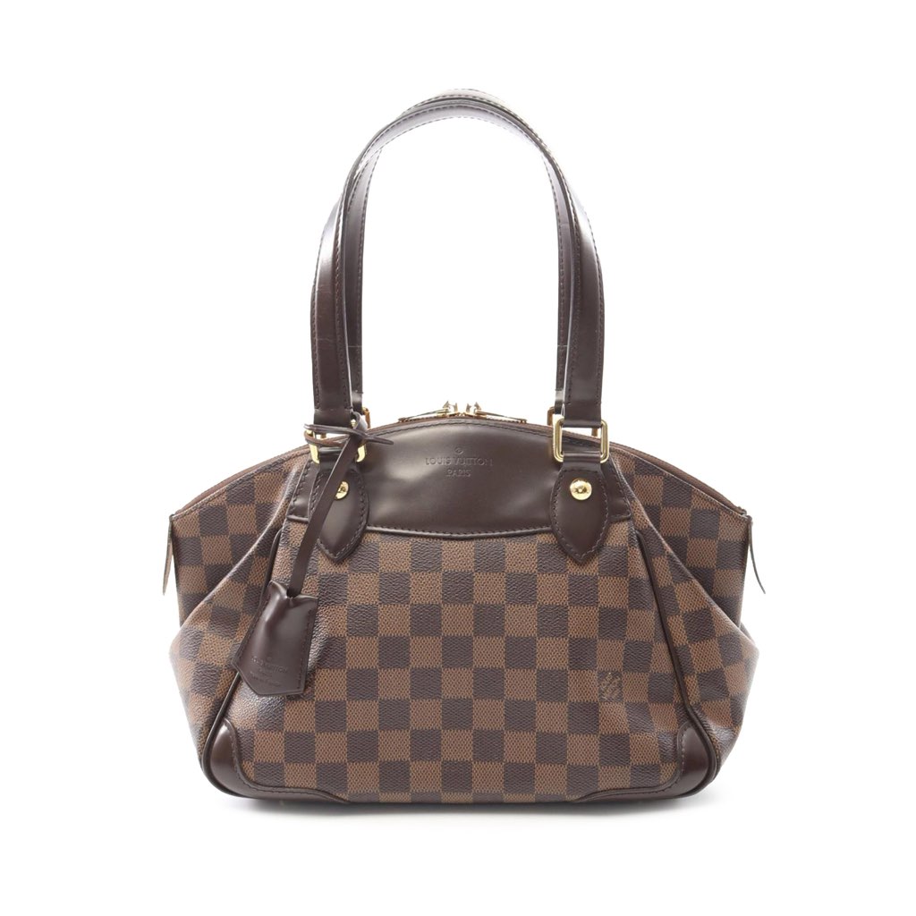 The Verona PM features a damier ebene canvas body with leather trim, flat leather handles, a top zip closure, and an interior slip pocket.
