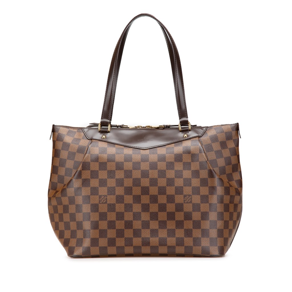 The Westminster features a damier canvas body, flat leather straps, top zip closure, and interior slip pockets.