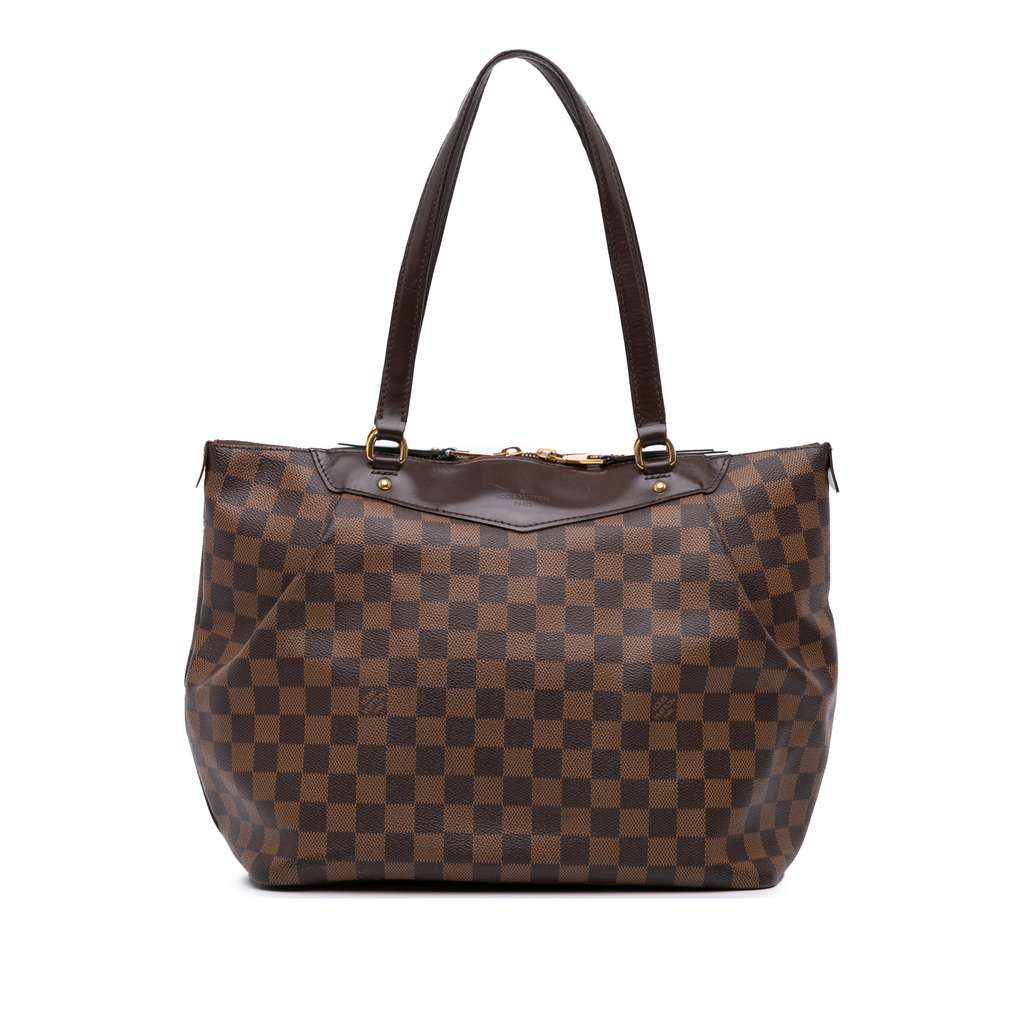 The Westminster PM features a damier ebene canvas body with leather trim, flat leather straps, a top zip closure, and interior slip pockets.