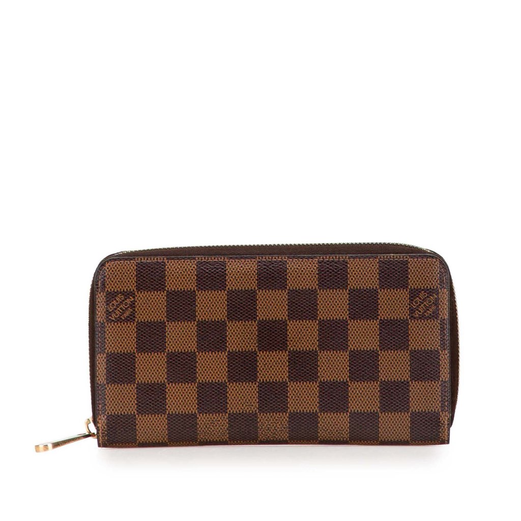 This long wallet features a damier ebene canvas body, a zip-around closure, an interior zip compartment, and interior slip pockets.