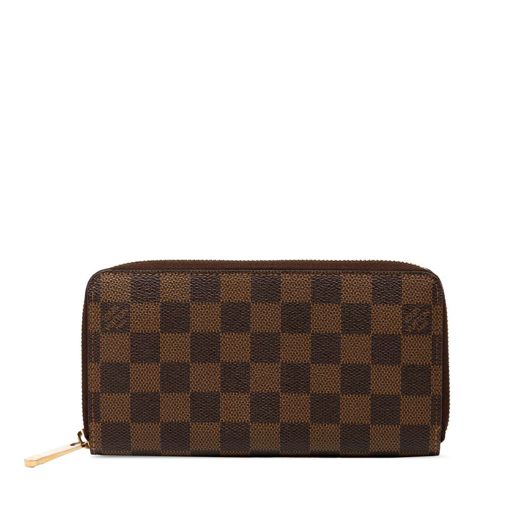 This wallet features a damier canvas body, a zip around closure, an interior zip compartment, and interior slip pockets.