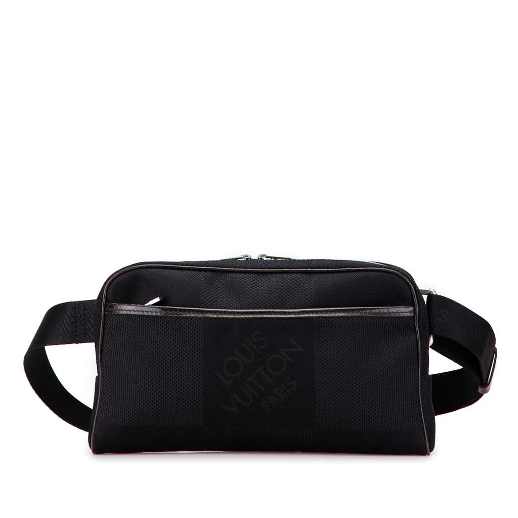 The Acrobat features a damier geant canvas body with leather trim, a flat waist strap, a top zip closure, an exterior front zip pocket, and interior zip and slip pockets.