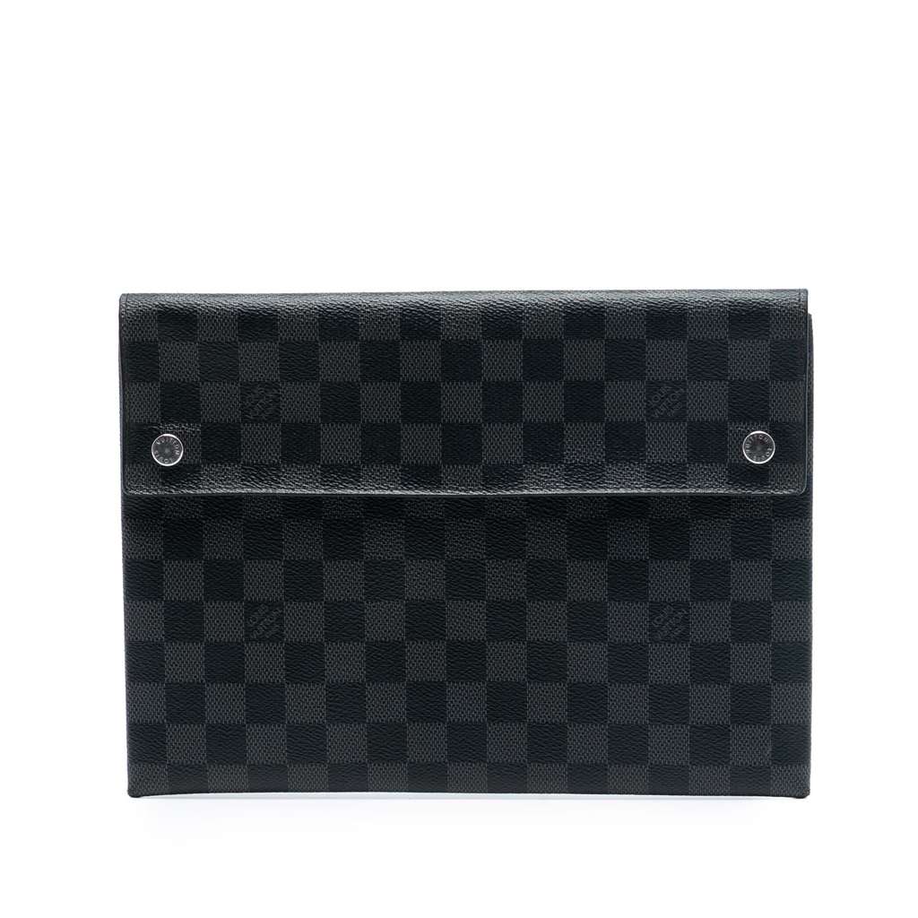 These Alpha Pochette features a damier graphite canvas body, and a front flap with snap button closures.
