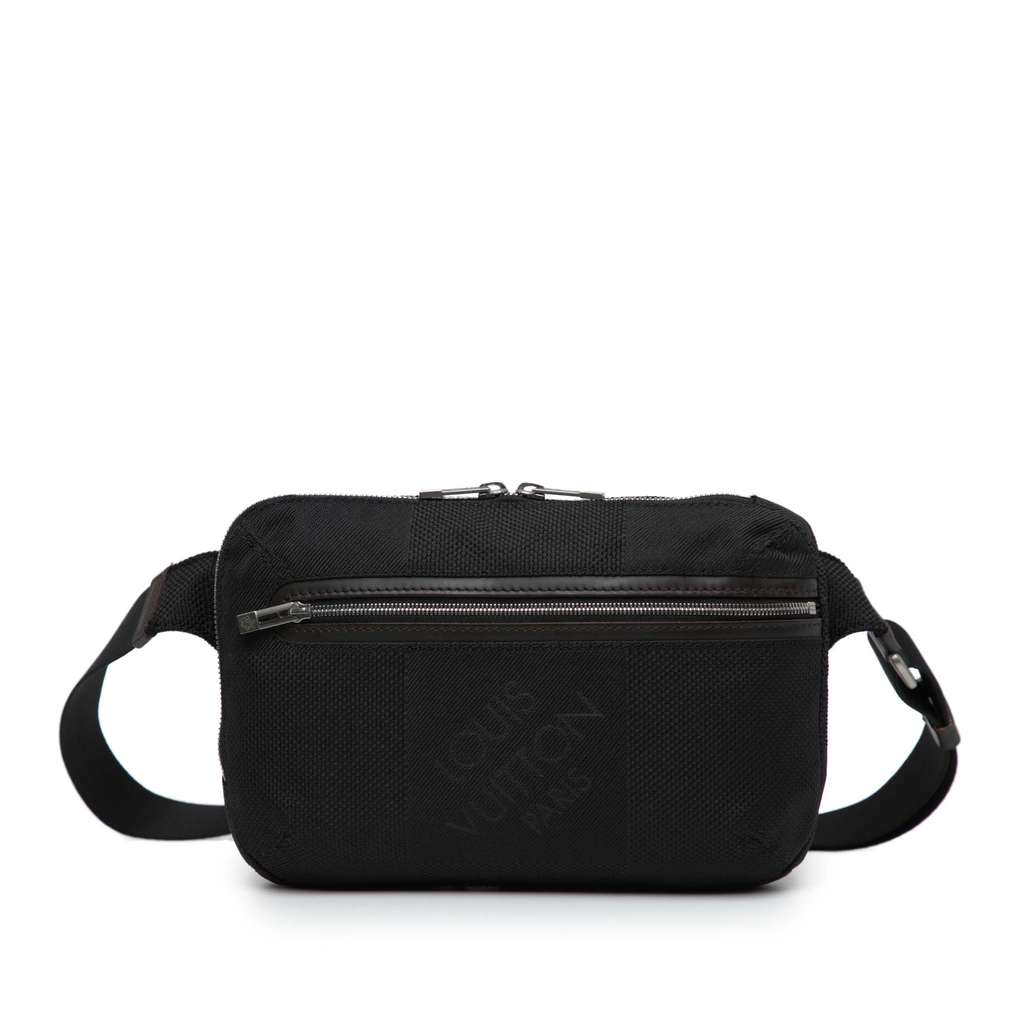The Ambler features a damier graphite canvas body, an adjustable flat waist strap, a top zip closure, an exterior front zip pocket, an exterior back zip pocket, and an interior slip pocket.