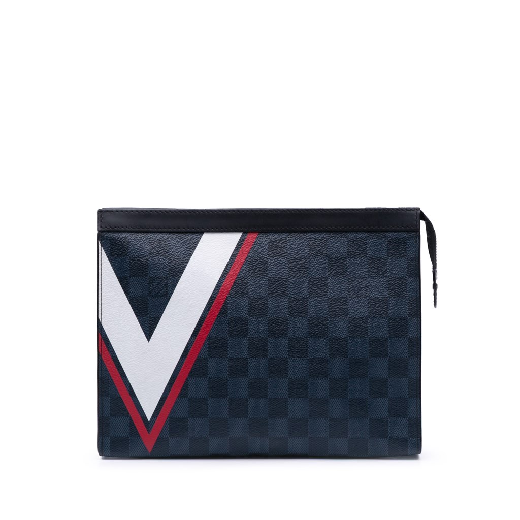The Voyage Pouch MM features a printed damier graphite canvas body with leather trim and a top zip closure.
