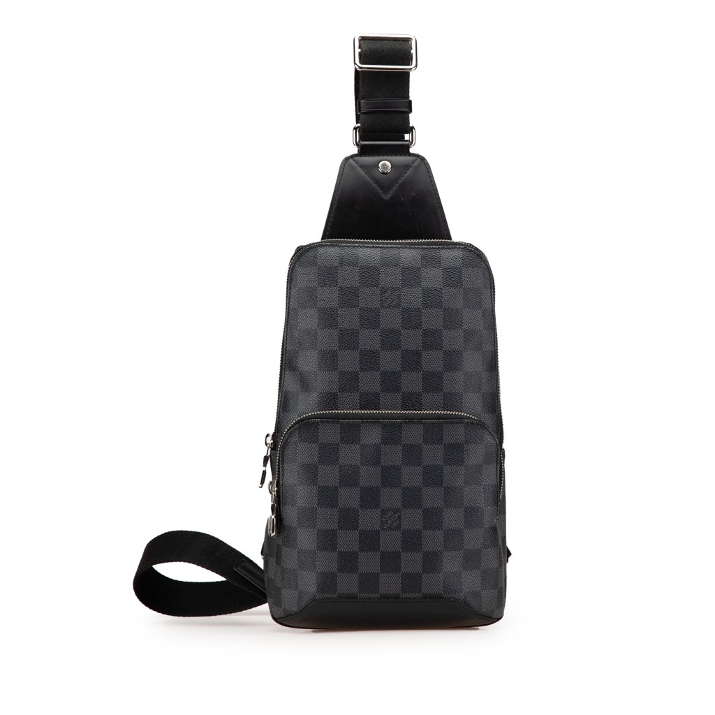 The Avenue features a damier graphite canvas body, an adjustable flat strap, a zip-around closure, an exterior front zip pocket, and interior slip pockets.
