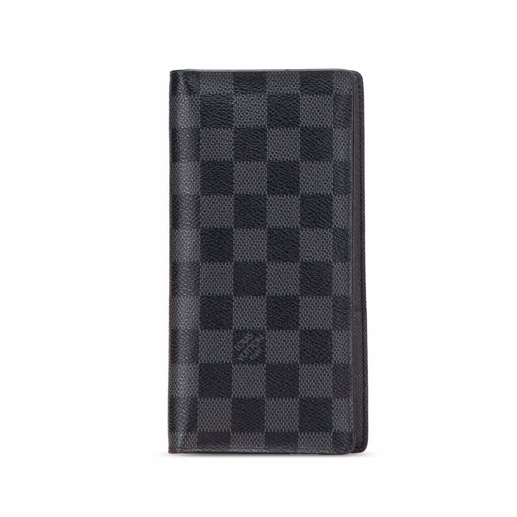 The Brazza wallet features a damier graphite canvas body, a flap, and interior zip and slip pockets.