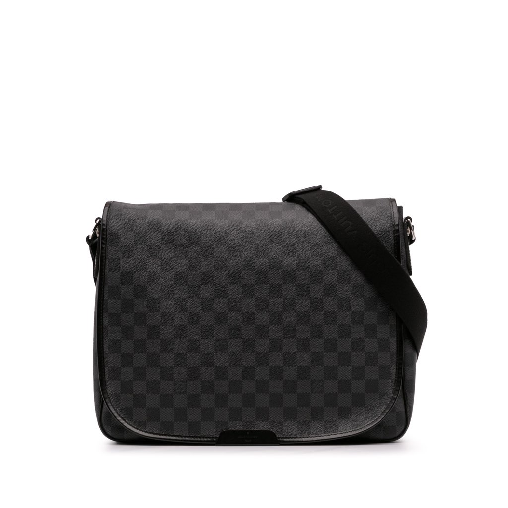 The Daniel features a damier graphite canvas body with leather trim, an adjustable flat shoulder strap, a front flap with magnetic snap closure, an exterior back zip pocket, and interior slip pockets.