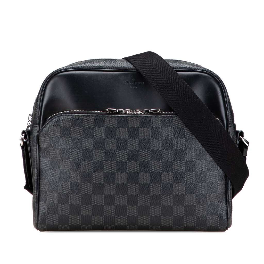 The Dayton Reporter PM features a damier graphite canvas body with leather trim, an adjustable flat shoulder strap, a top zip closure, an exterior zip compartment, and interior slip pockets.