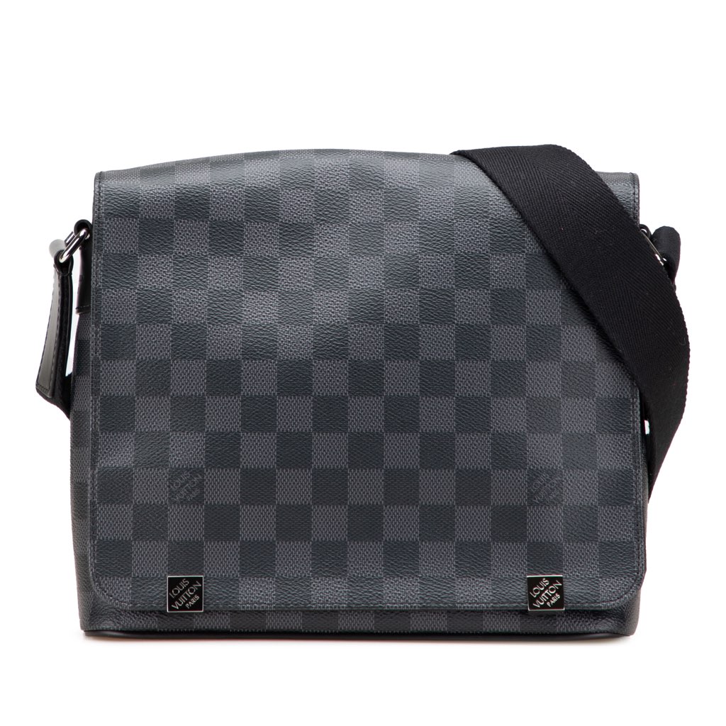 The District PM features a damier graphite canvas body, an adjustable flat shoulder strap, a front flap with magnetic closure, and an interior slip pocket.