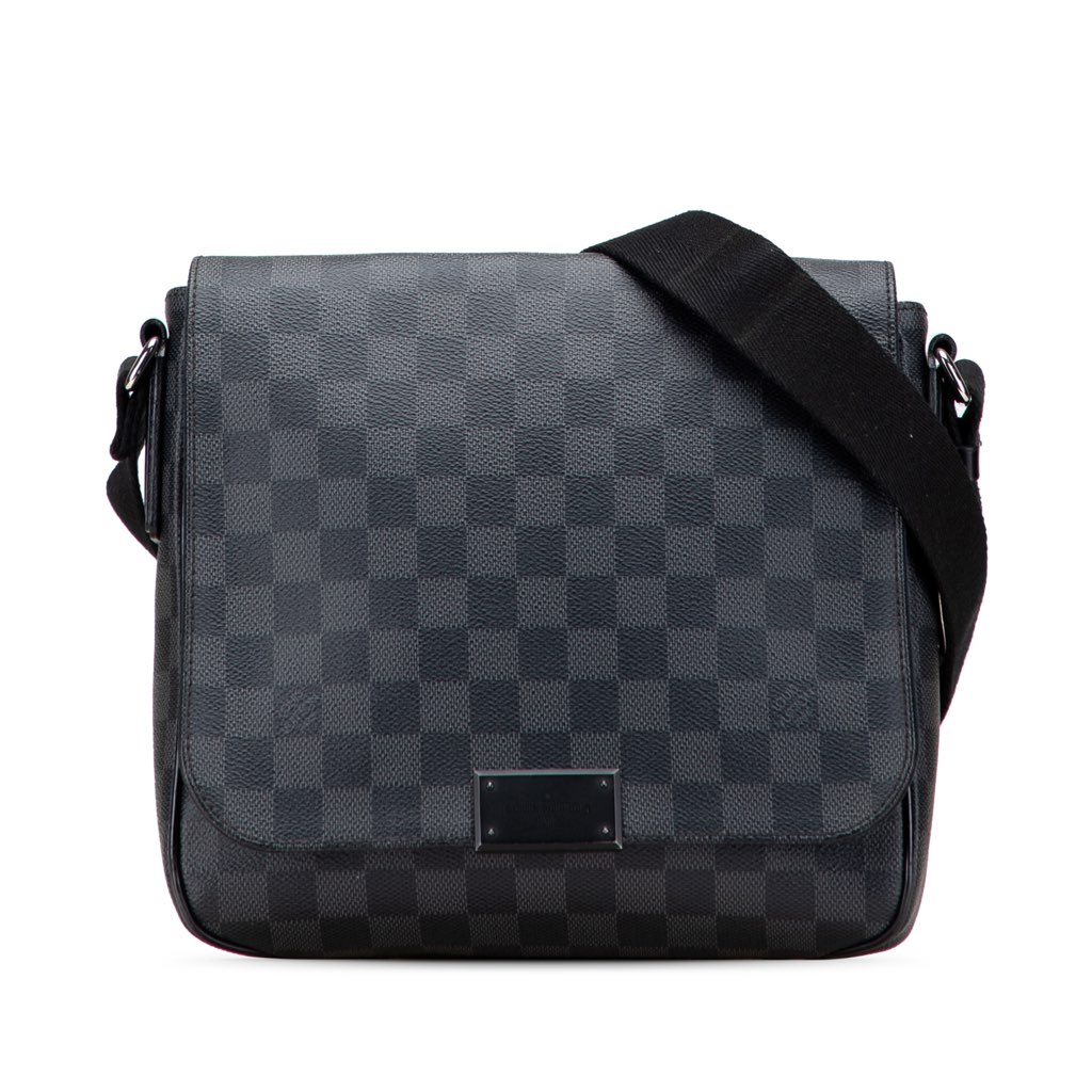 The District PM features a damier graphite canvas body, an adjustable flat canvas shoulder strap, a front flap with magnetic snap closure, an exterior slip pocket, and an interior slip pocket.