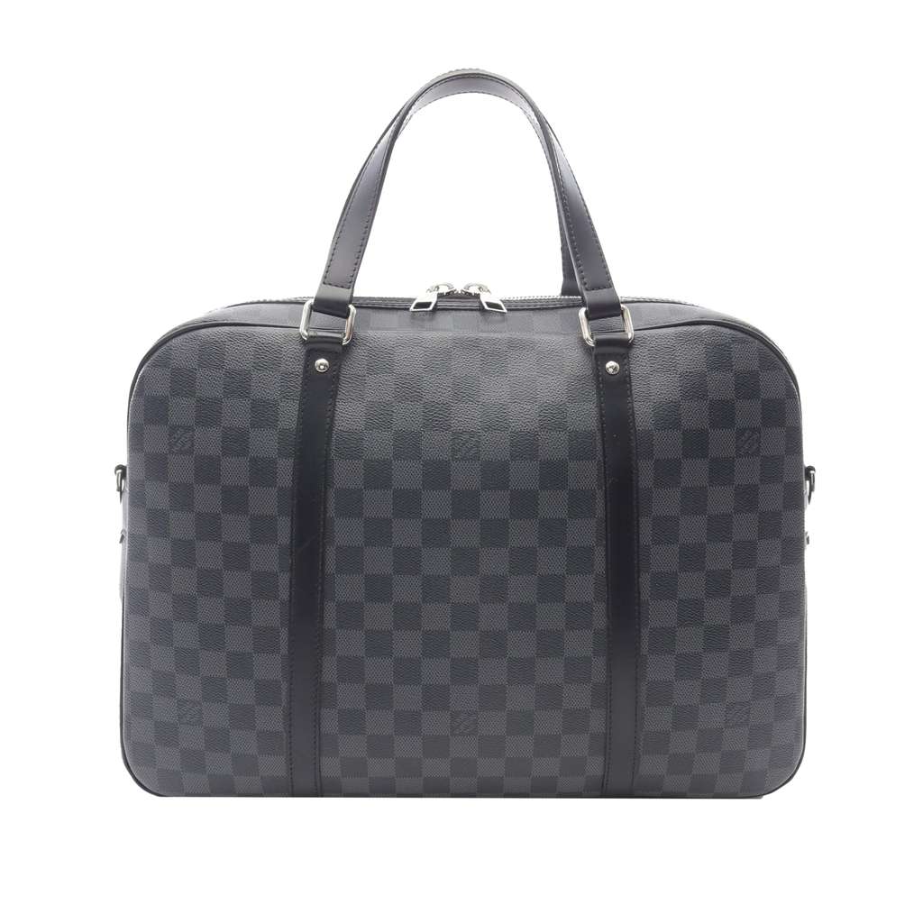 The Jorn features a damier graphite canvas body with leather trim, flat leather handles, a top zip closure, and interior zip and slip pockets.