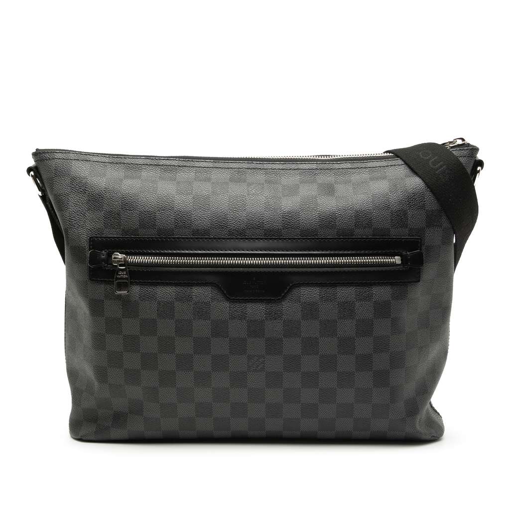 The Mick MM features a damier canvas body with leather trim, an adjustable flat canvas strap, a top zip closure, an exterior front and back zip pockets, and interior slip pockets.