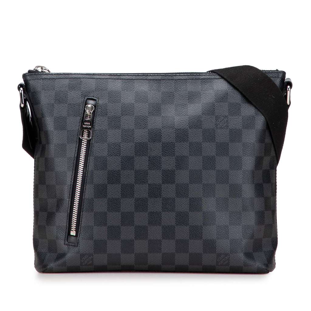 The Mick PM features a damier graphite canvas body, an adjustable flat strap, a top zip closure, an exterior front zip pocket, and interior slip pockets.