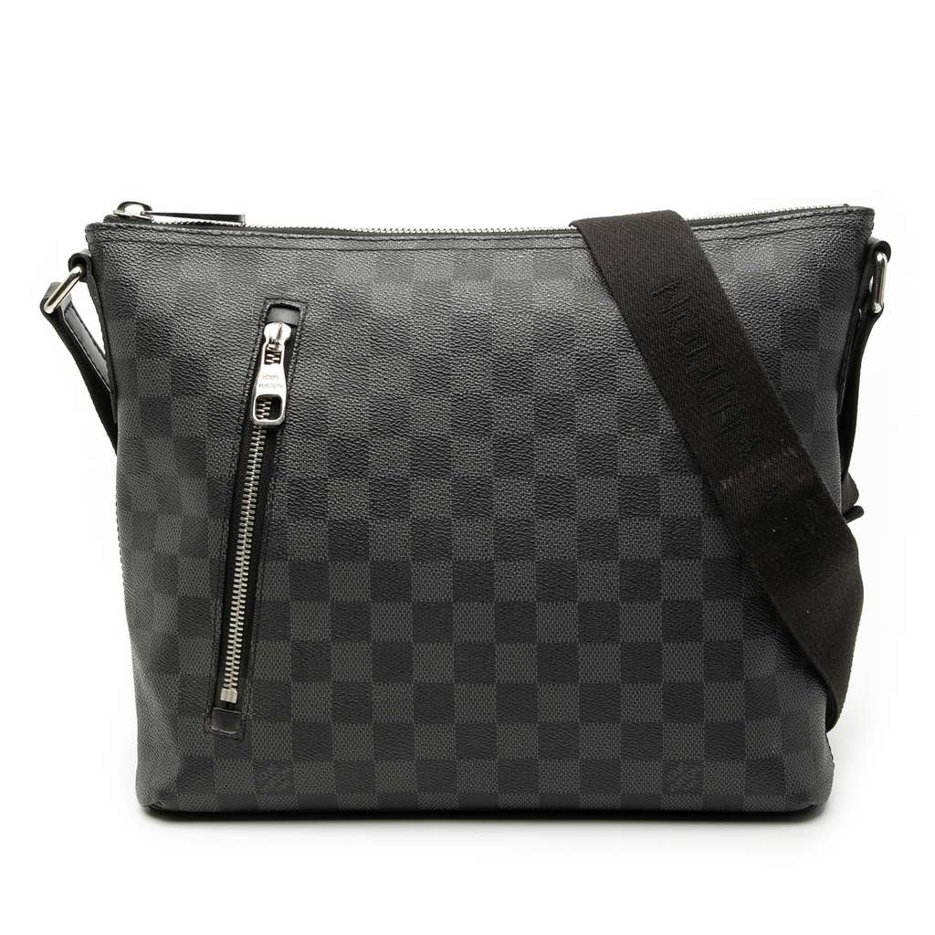 The Mick PM features a damier canvas body, an adjustable flat canvas strap, a top zip closure, an exterior front zip pocket, and interior slip pockets.