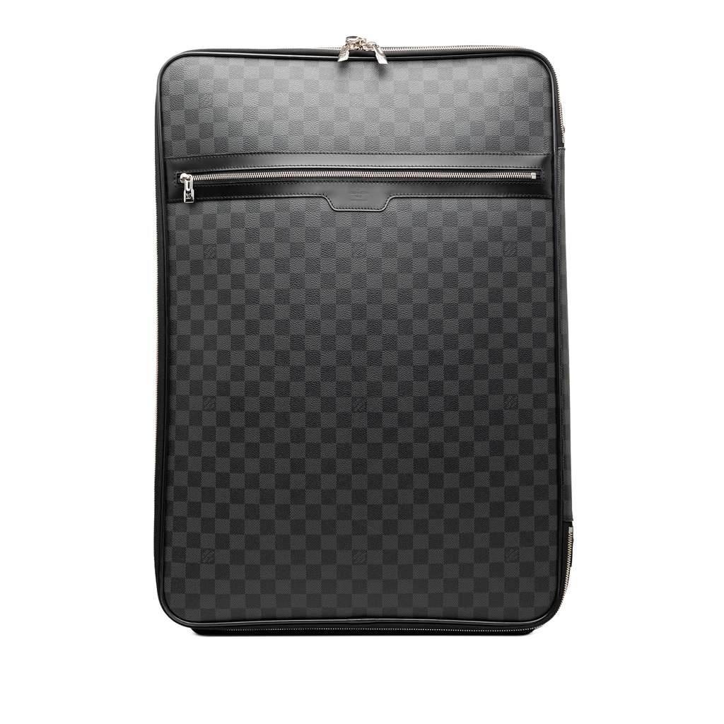 The Pegase 65 features a damier graphite canvas body with leather trim, a flat leather side handle, a retractable top handle, dual wheels, a zip-around closure, an exterior front zip pocket, and interior zip and slip compartments.