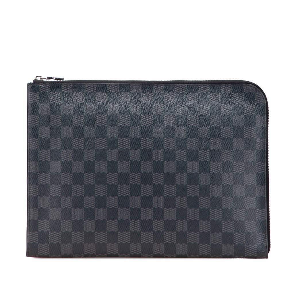 The Pochette Jour features a damier graphite canvas body, a top zip closure, and an interior slip pocket.