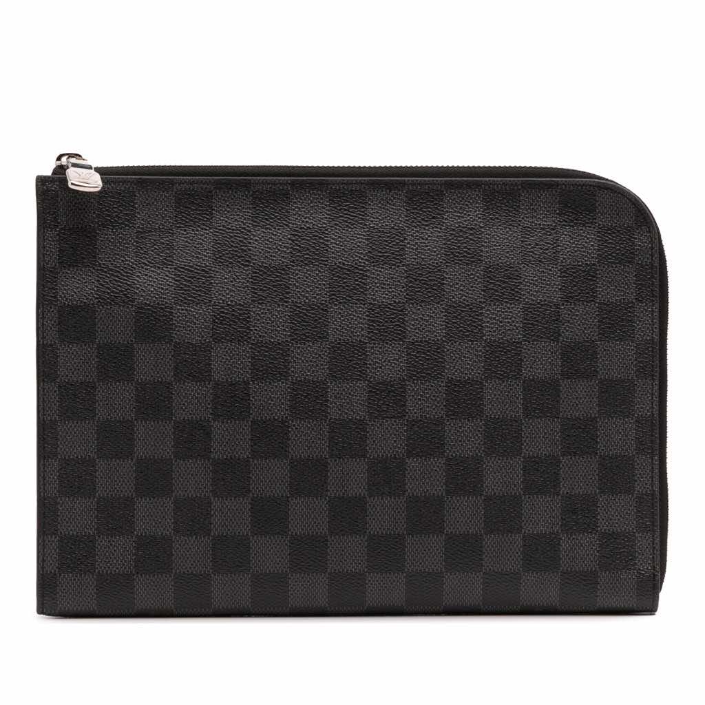 This pochette features a damier graphite canvas, a zip around closure, and interior slip pockets.