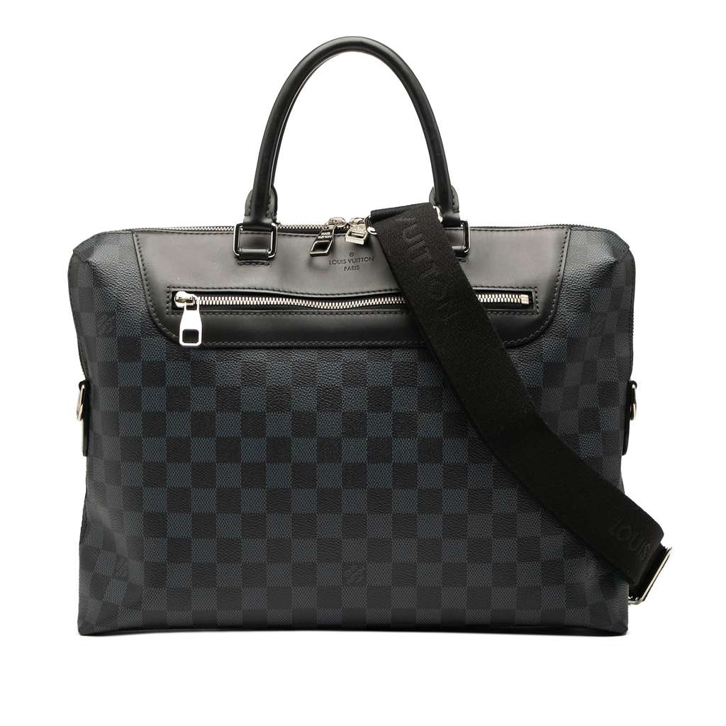 The Porte Documents Jour features a damier graphite canvas body with leather trim, rolled leather handles, a detachable and adjustable strap, a top zip closure, an exterior front zip pocket, and interior slip pockets.