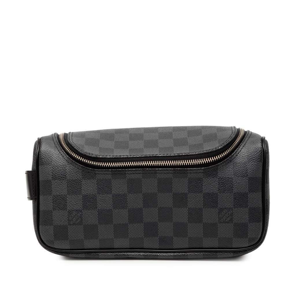 This pouch features a damier graphite canvas body, a top zip around closure, and an interior zip pocket.