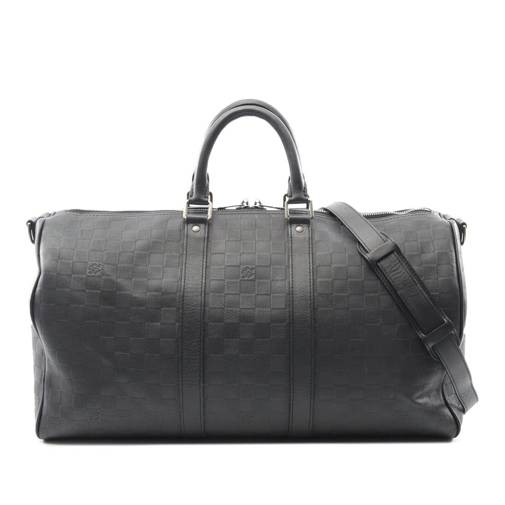 The Keepall Bandoulière 45 features a leather body, rolled leather handles, a detachable flat leather strap, a top zip closure, and interior slip and zip pockets.