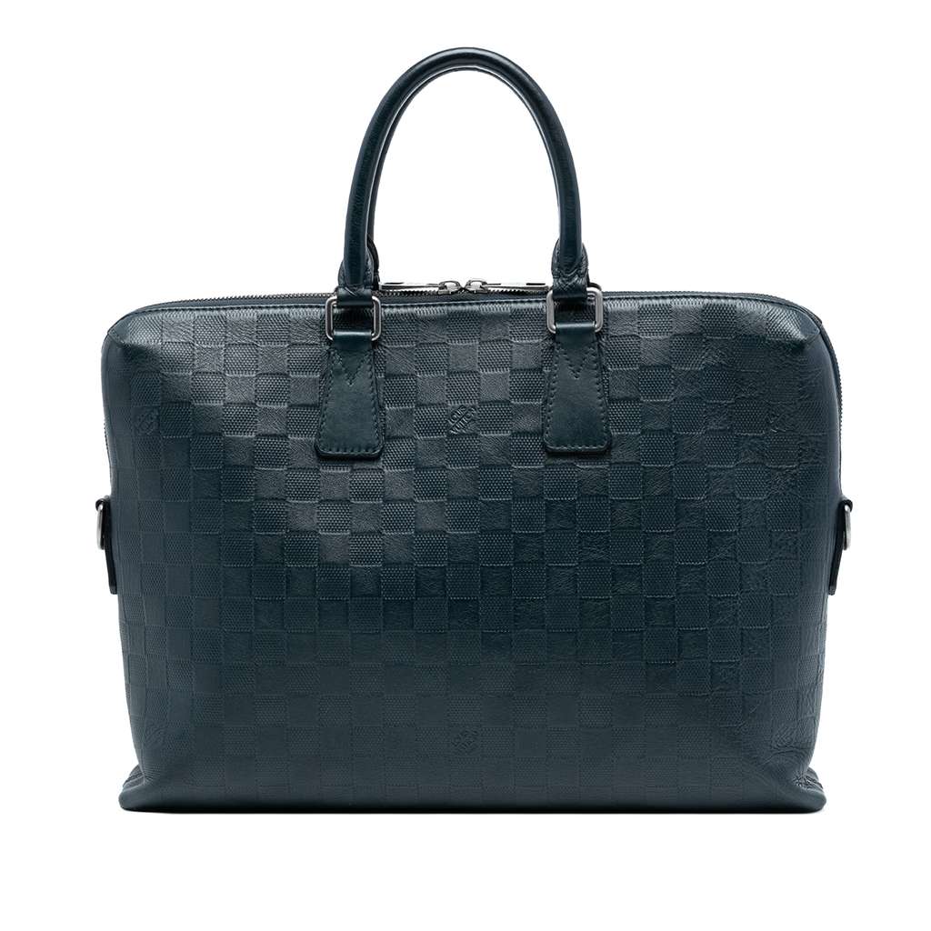 This business bag features a damier infini leather body, rolled leather handles, and interior slip pockets.