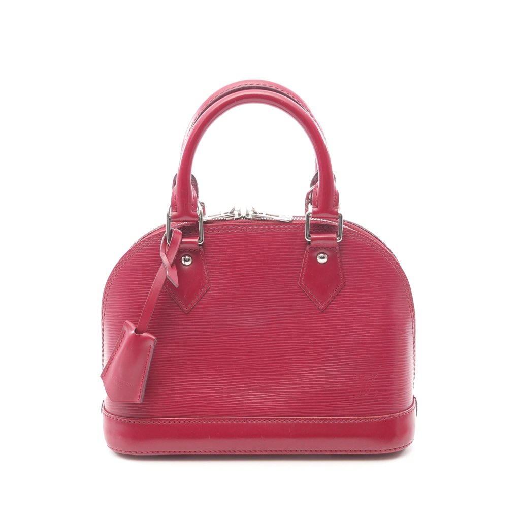 The Alma BB features an epi leather body, rolled top handles, a flat leather shoulder strap, and a top zip closure.