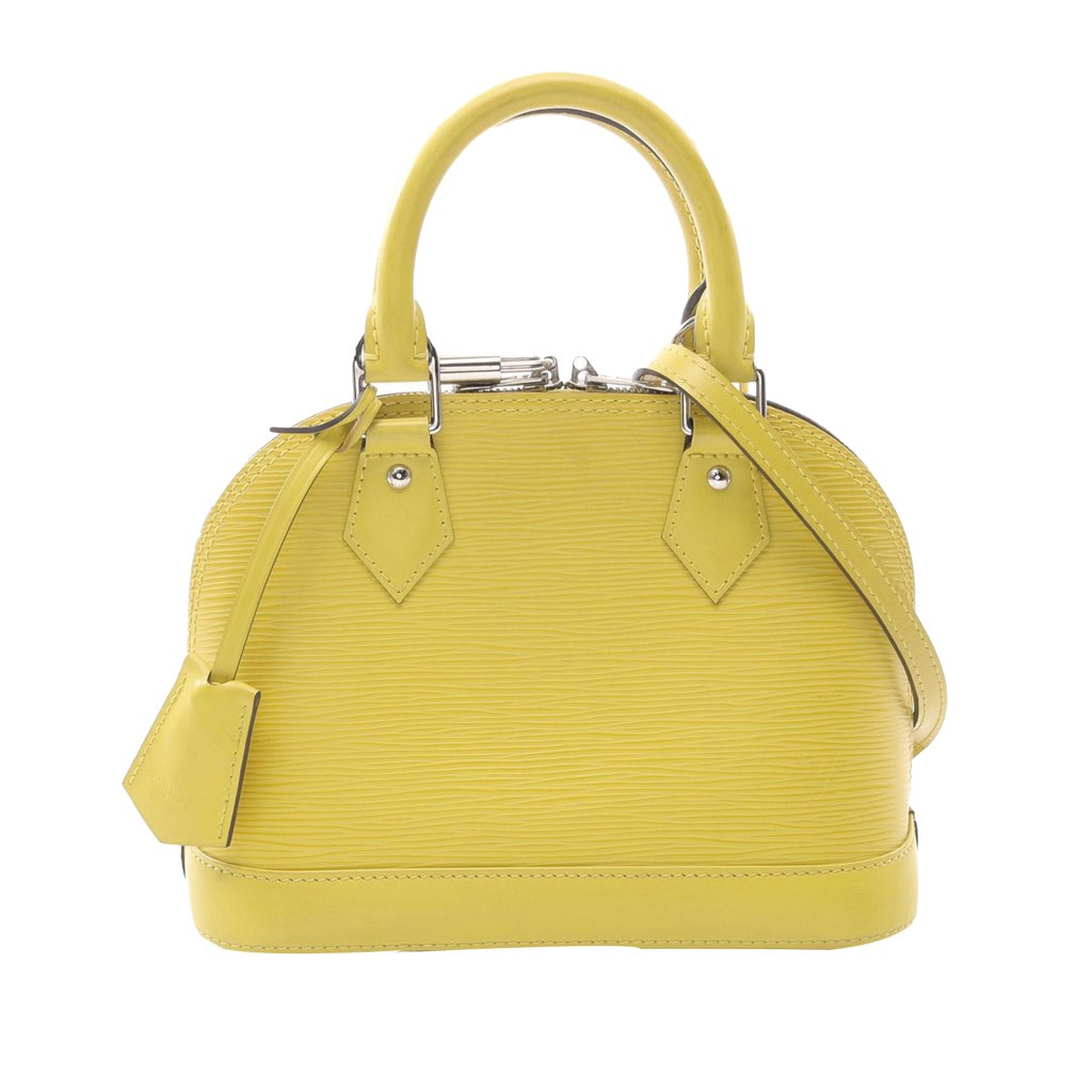 The Alma BB features an epi leather body, rolled top handles, a detachable flat leather strap, a top zip closure, and an interior slip pocket.