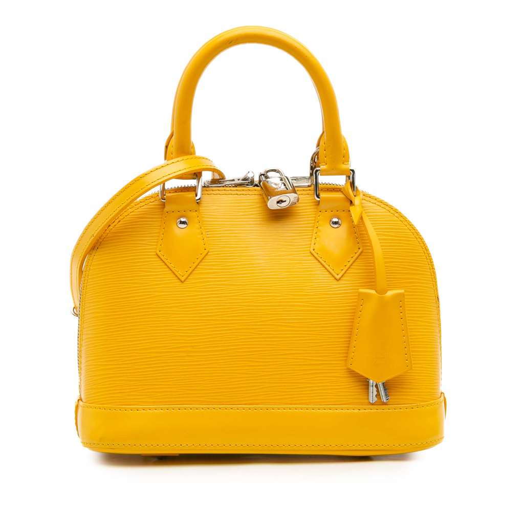 The Alma BB features an epi leather body, rolled top handles, a detachable flat leather strap, a top zip closure, and an interior slip pocket.