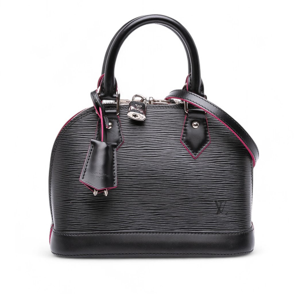 The Alma BB features an epi leather body, rolled leather top handles, a detachable flat leather strap, a top zip closure, and an interior slip pocket.