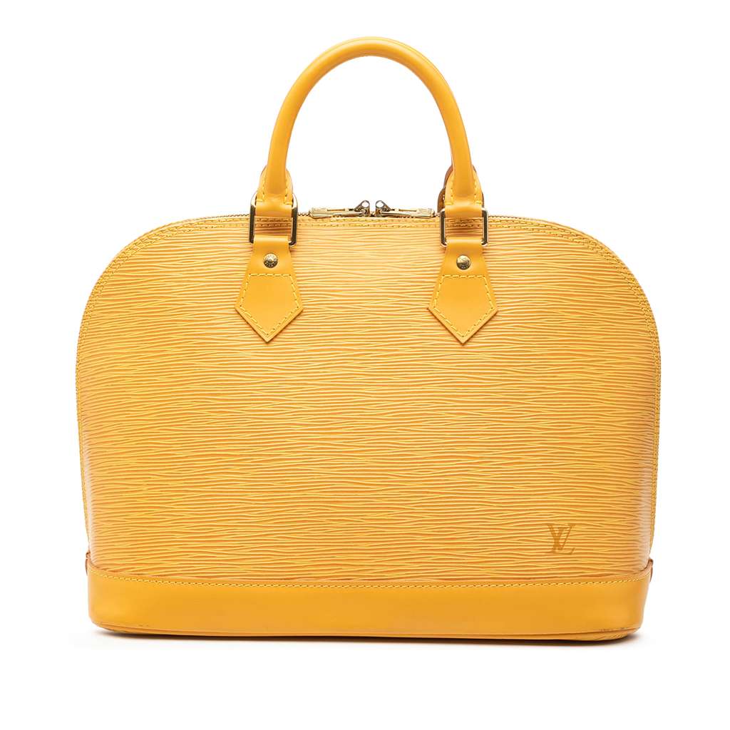 The Alma PM features an epi leather body, rolled handles, a top zip closure, and an interior slip pocket.