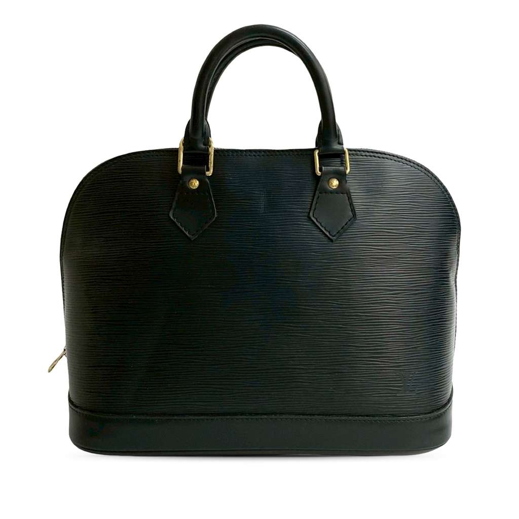 The Alma PM features an epi leather body, rolled handles, a top zip closure, and an interior slip pocket.