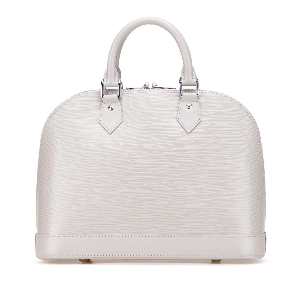 The Alma PM features an epi leather body, rolled leather handles, a top zip closure, and interior slip pockets.