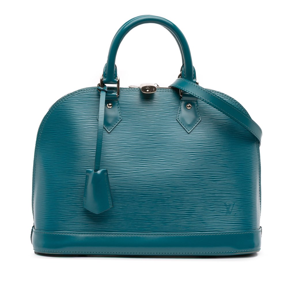 The Alma PM features an epi leather body, rolled leather handles, a detachable flat leather strap, a top zip closure, and an interior slip pocket.