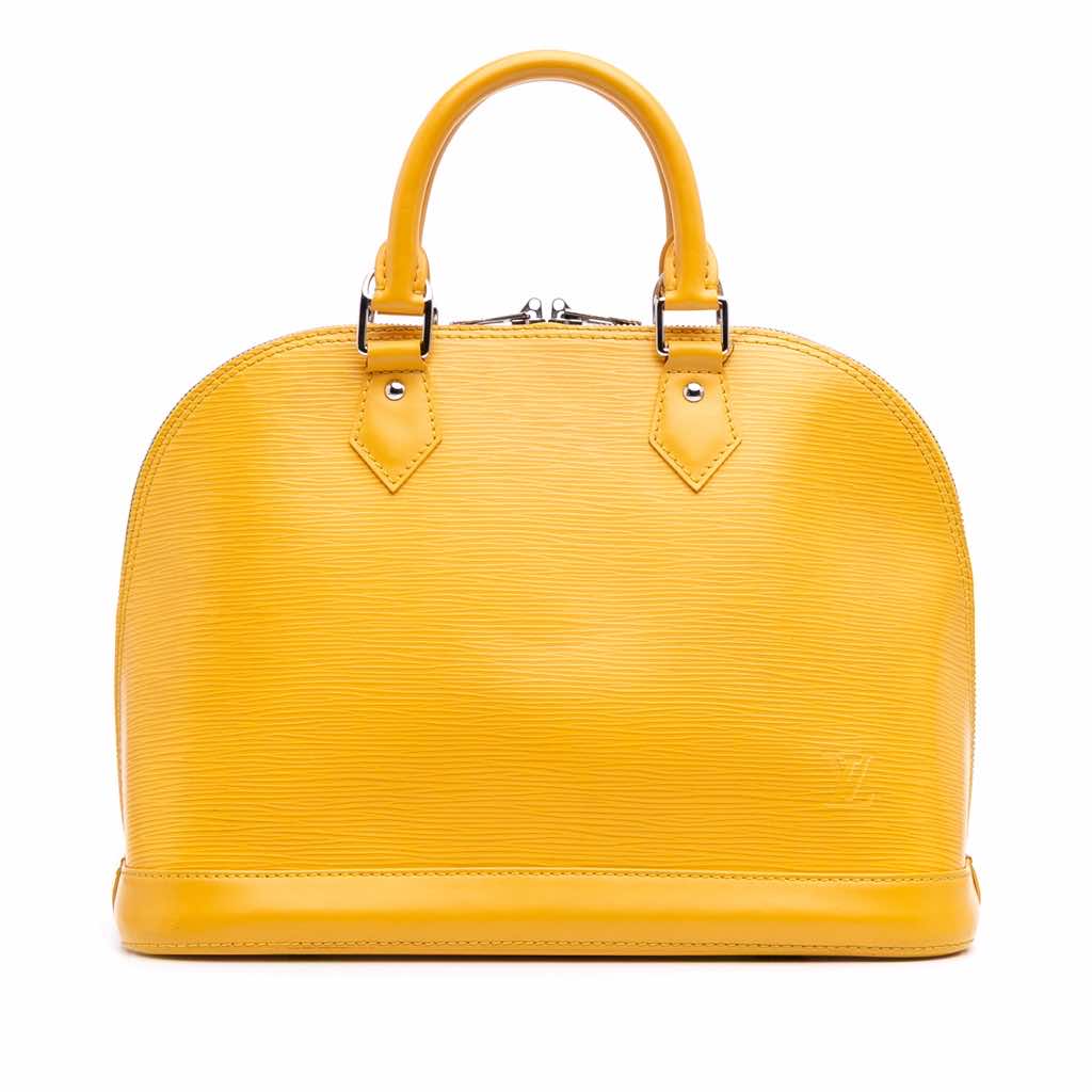 The Alma PM features an epi leather body, rolled handles, a top zip closure, and interior slip pockets.
