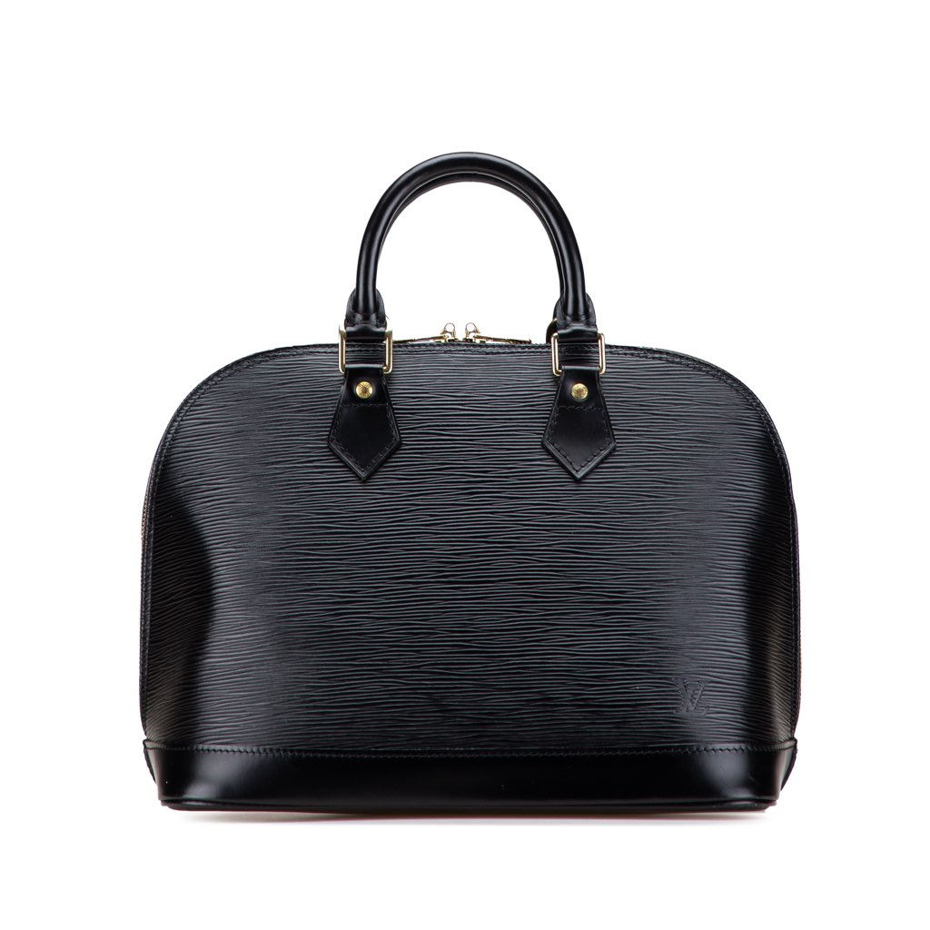 The Alma PM features an epi leather body, rolled leather handles, a top zip closure, and an interior slip pocket.