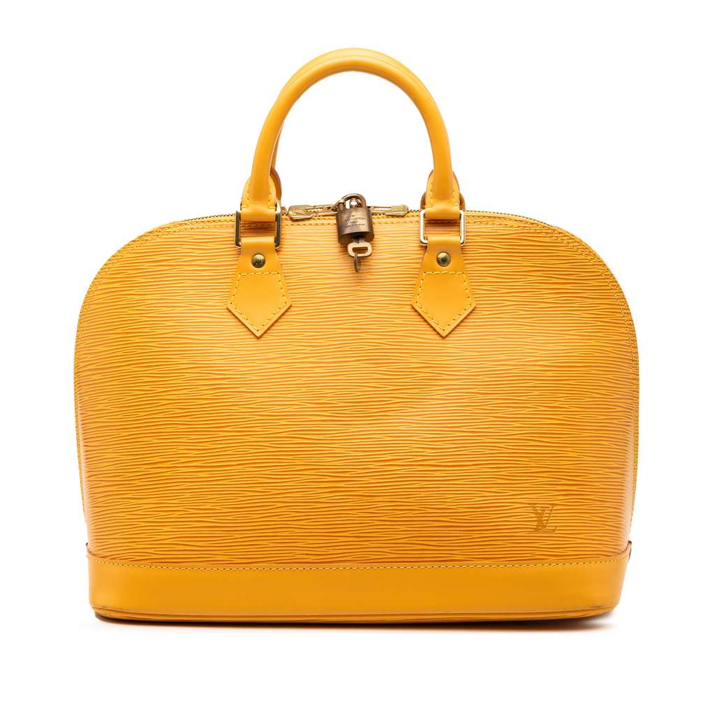 The Alma PM features an epi leather body, rolled leather handles, a top zip closure, and an interior slip pocket.