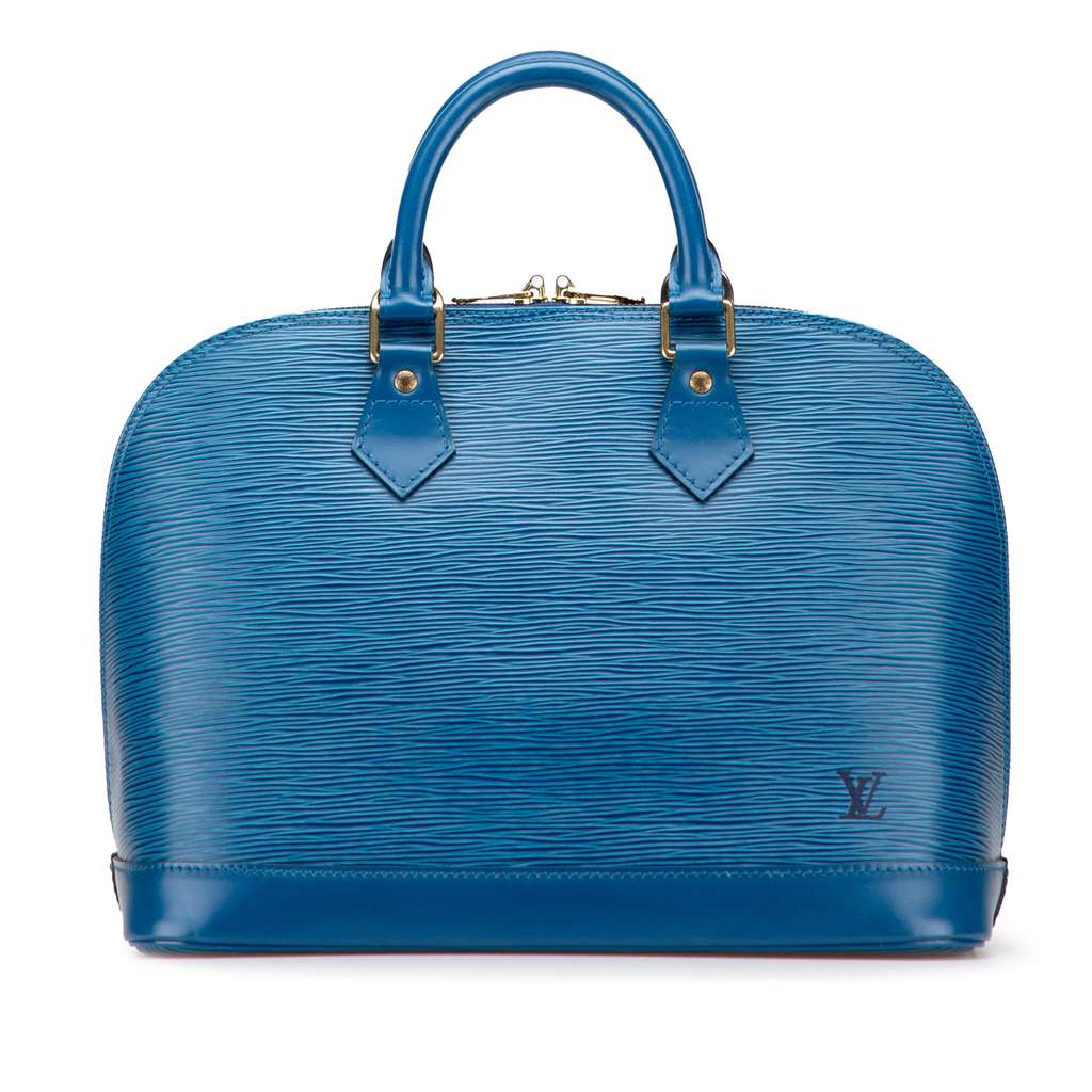 The Alma PM features an epi leather body, rolled leather handles, a top zip closure, and an interior slip pocket.