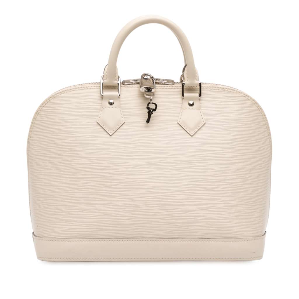 The Alma PM features an epi leather body, rolled leather handles, a top zip closure, and interior slip pockets.