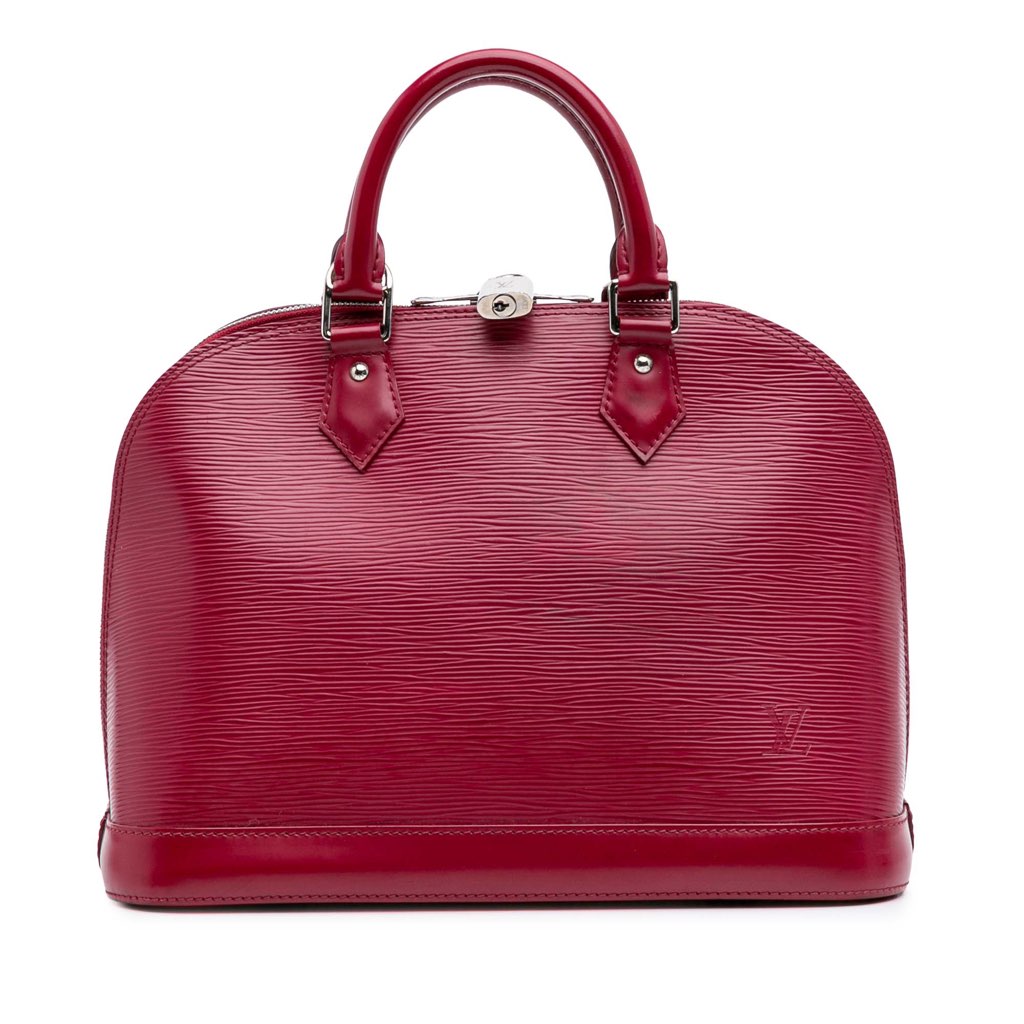 The Alma PM features an epi leather body, rolled leather handles, a top zip closure, and an interior slip pocket.